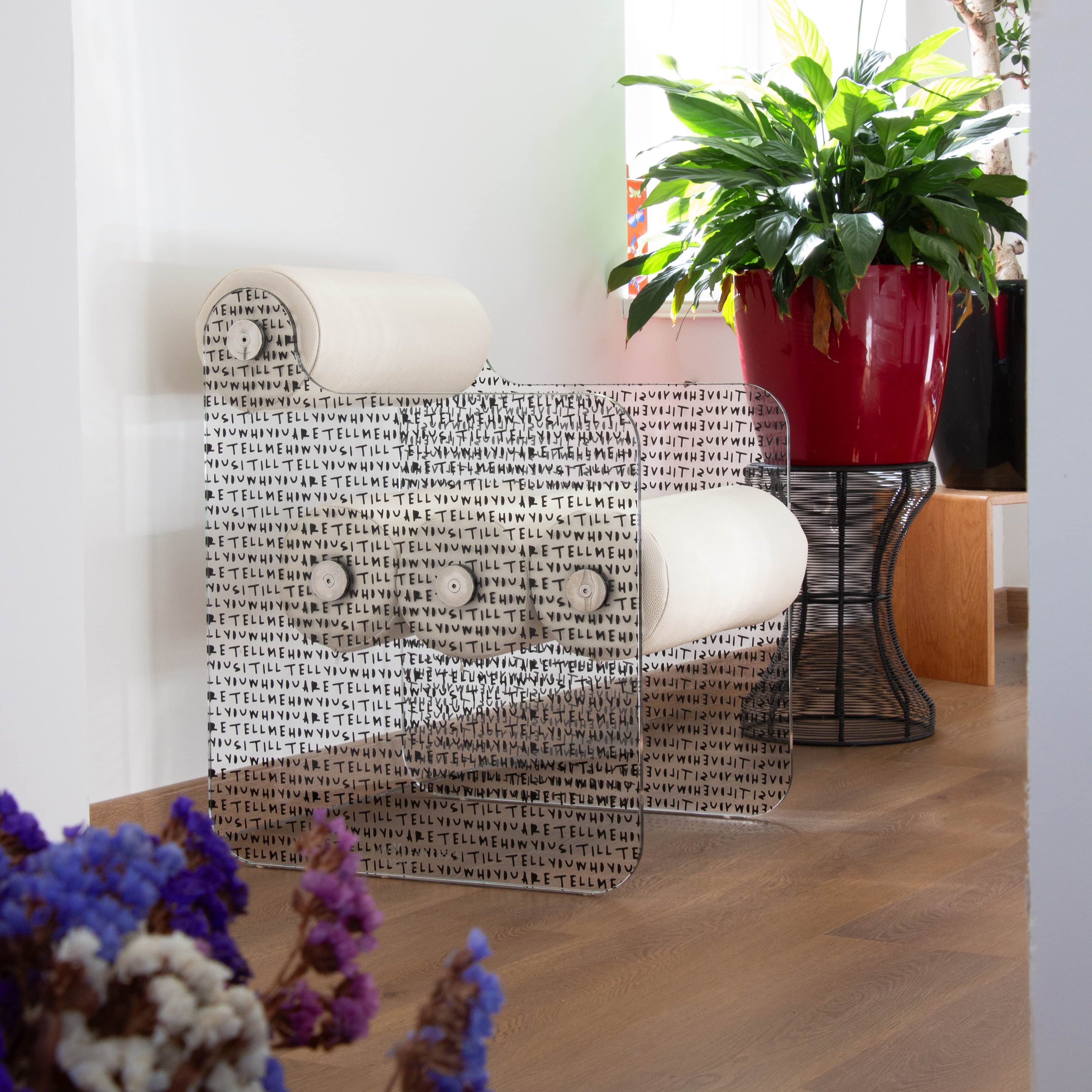 Der MW04-„J’adore“-Stuhl, Gewinner des MIAW Design Award 2022, vereint Komfort, zeitgenössische Eleganz und künstlerische Kreativität. In einer auf 20 Exemplare limitierten Edition wurde er in Zusammenarbeit mit der Künstlerin Leah Kirsch entworfen. Die mit keramischer Tinte bedruckten und mit dem Glas verschmolzenen Paneele zeigen: „Tell me how you sit, I’ll tell you who you are“ und „I love how you sit!“. Dieser Stuhl fügt sich in jedes Interieur ein und ist sowohl eine bequeme Sitzgelegenheit als auch ein einzigartiges Sammlerstück. Erhältlich mit einem Sitz aus Schaumstoff, bezogen mit veganem Leder in Pearl oder Anthrazit.