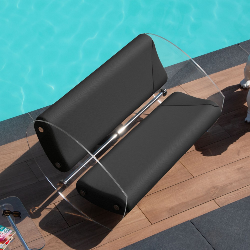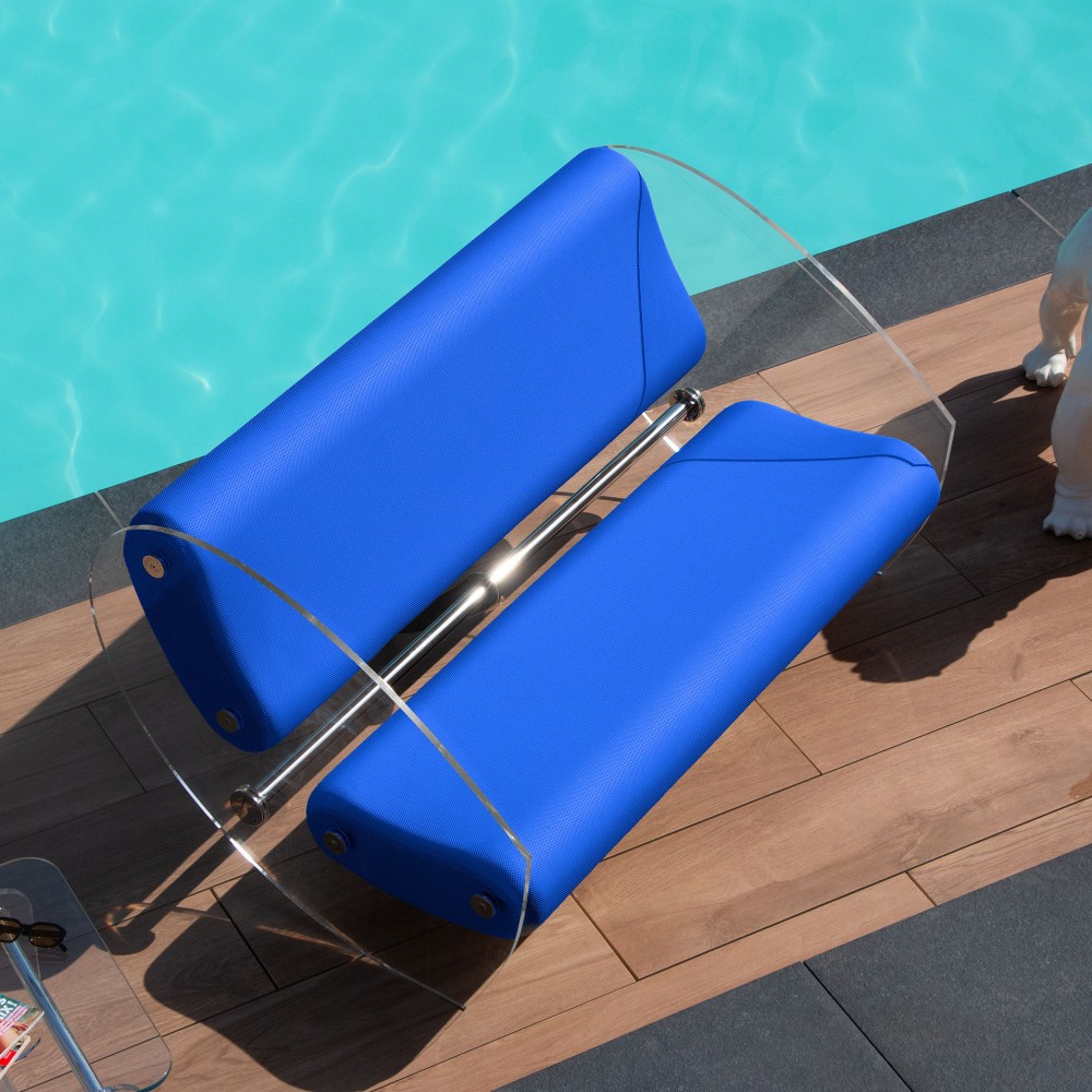 Seine transparenten gegossenen PMMA-Seitenwände und das Edelstahlfußteil, sichtbar zwischen den beiden bohnenförmigen Kissen, verleihen ihm eine luftige Optik und bemerkenswerte Ästhetik.