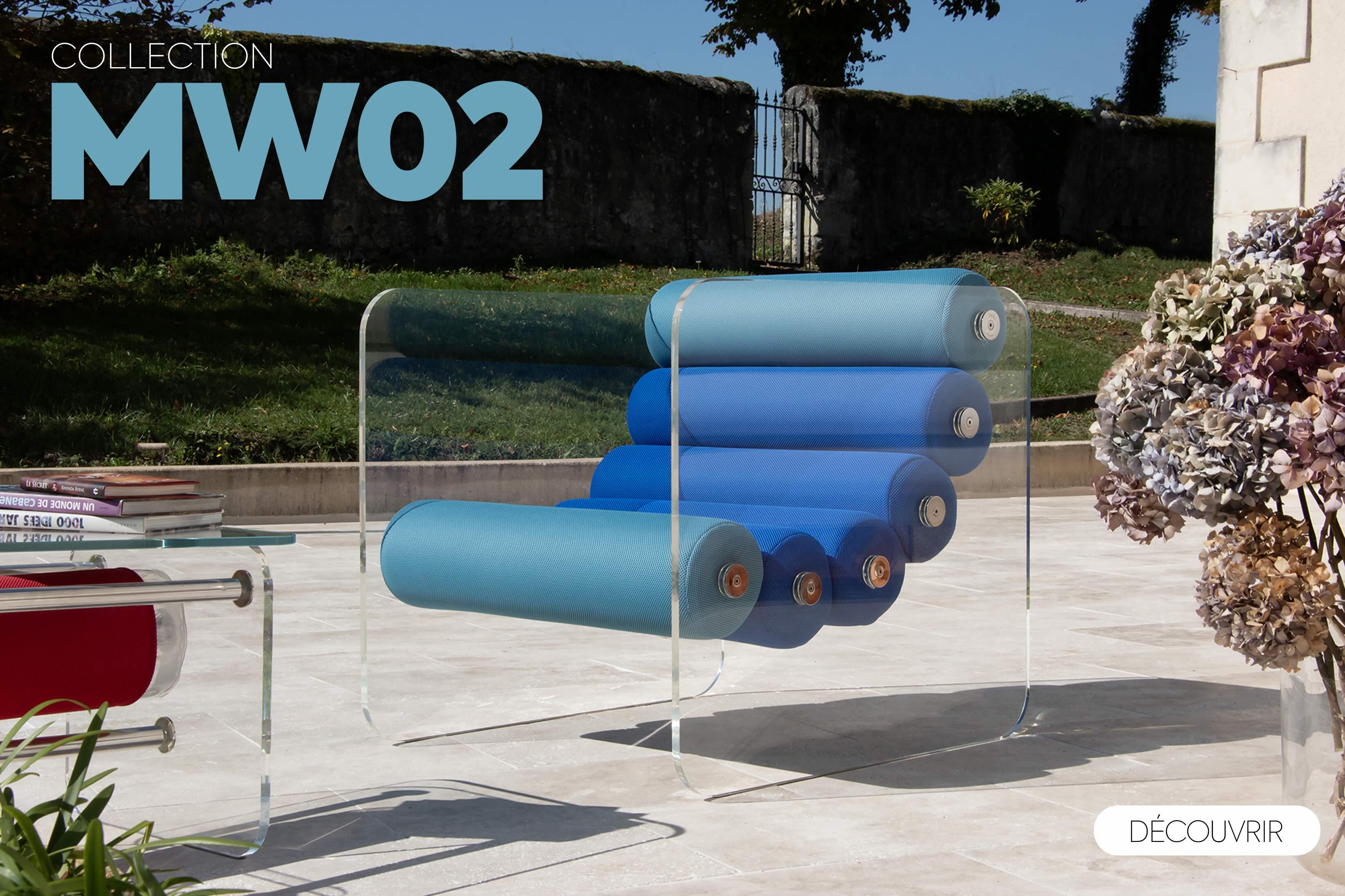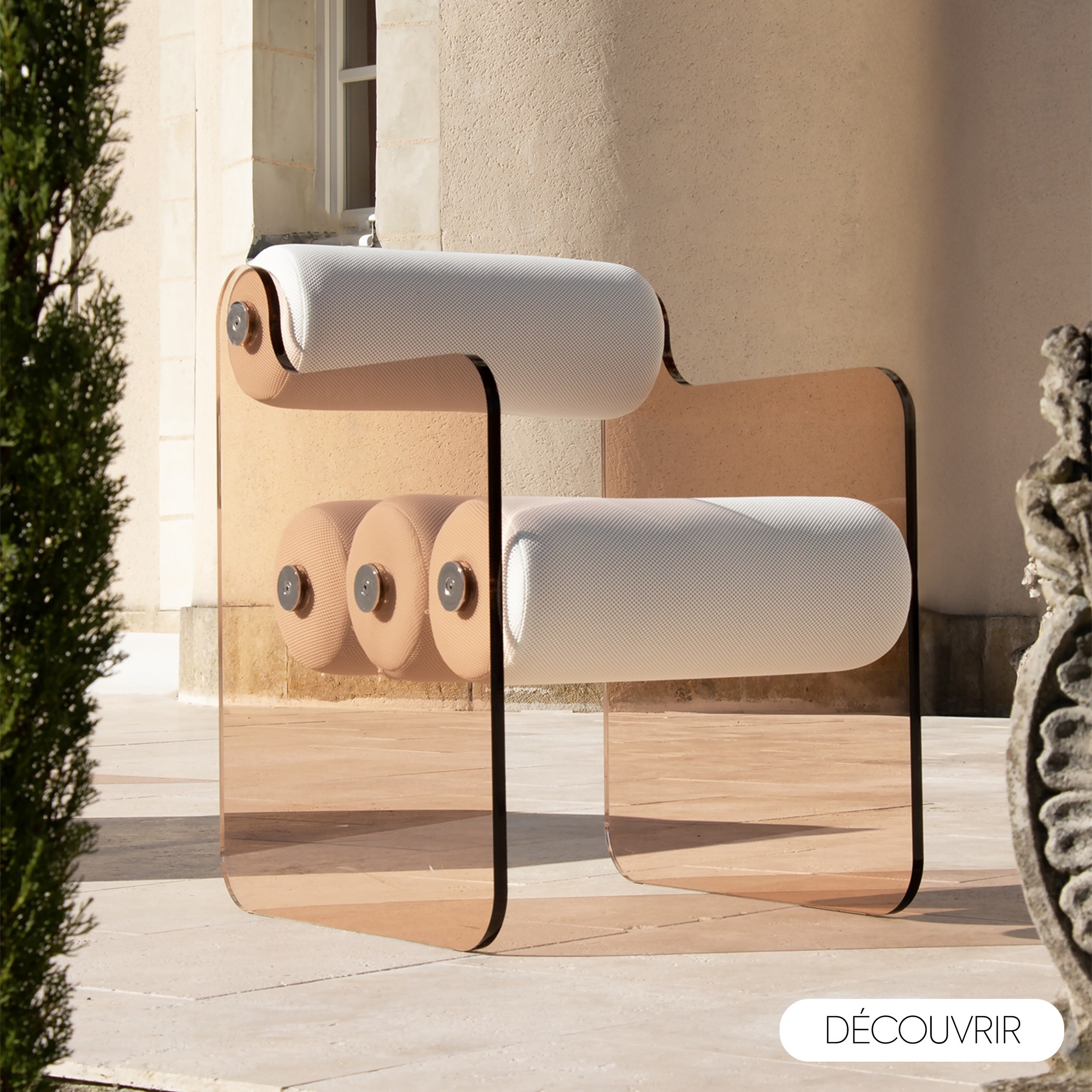 Fauteuil design MW02 – Parois en PMMA coulé, assise en mousse alvéolaire et tissu 3D