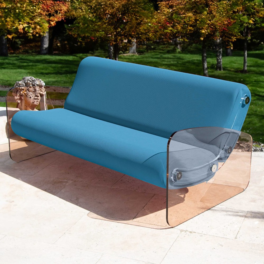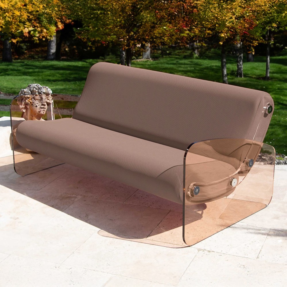 Ses parois et accoudoirs en PMMA coulé couleur bronze structurent l’espace avec élégance et légèreté. Résistantes aux chocs et aux rayures, elles assurent une grande durabilité en extérieur.