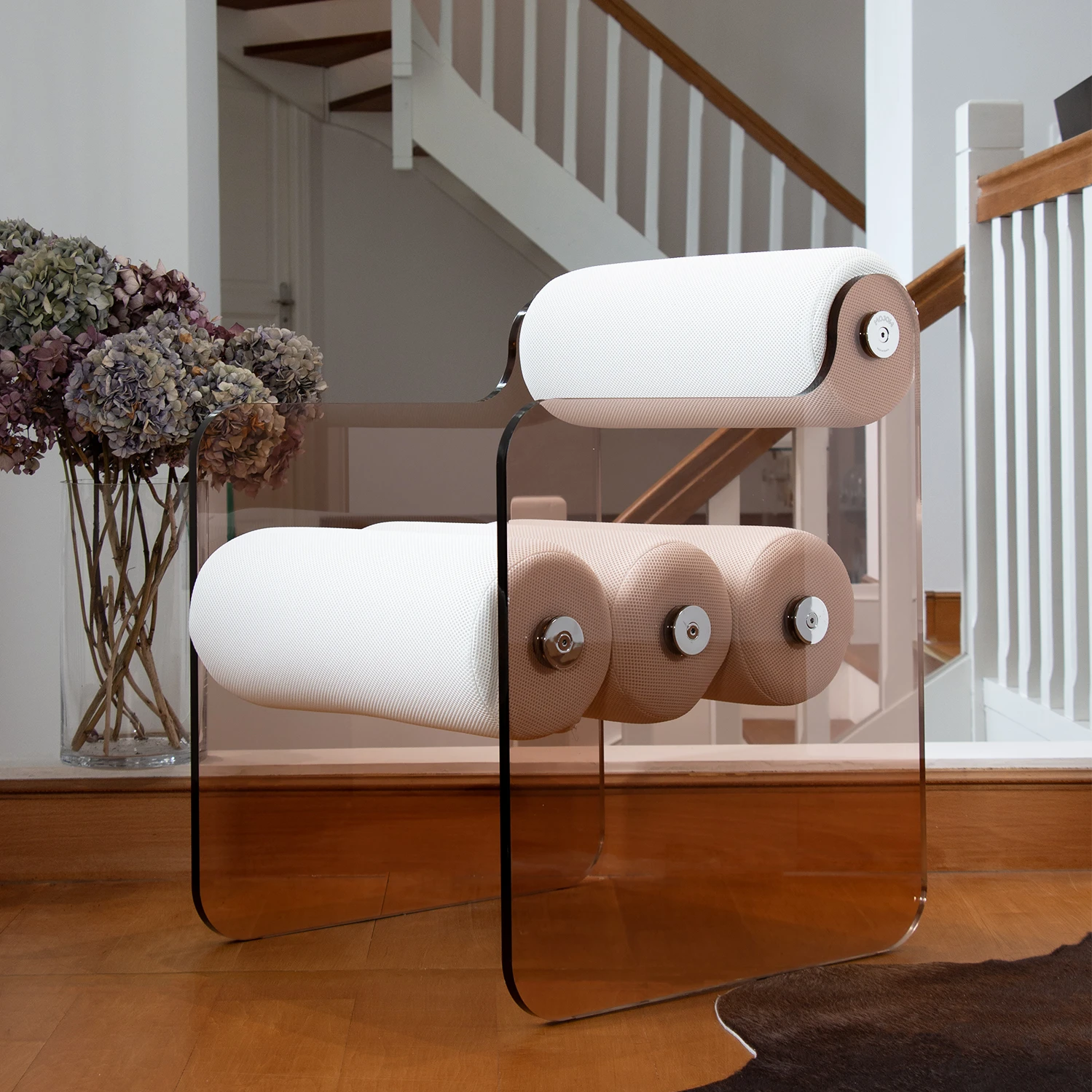 La chaise MW04, avec ses parois en PMMA coulé bronze et son assise en mousse HR recouverte d’un tissu 3D blanc, incarne un design épuré parfaitement adapté aux environnements intérieurs. Elle offre un confort optimal tout en sublimant l’esthétique de tout espace de vie.