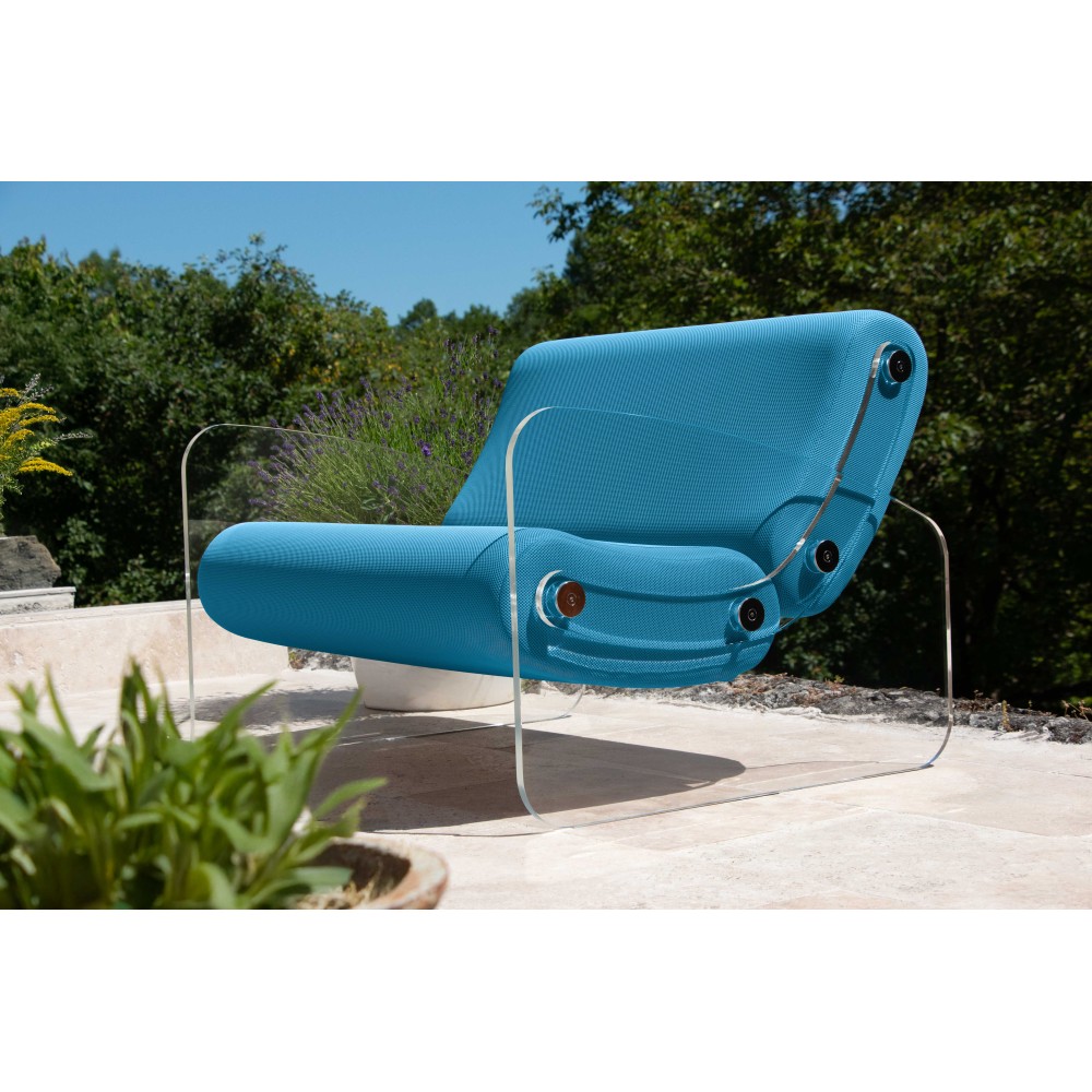 Le MW03 propose des coussins indépendants en forme de haricot, offrant un confort enveloppant et une assise ergonomique. Deux pièces en PMMA transparent en forme de boomerang maintiennent les coussins et soulignent son caractère sculptural.